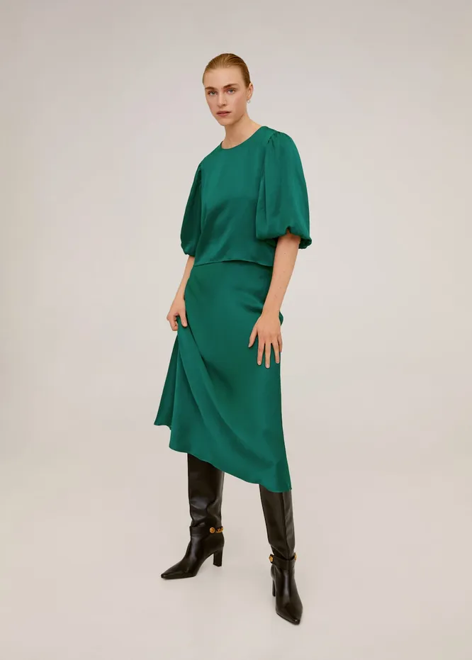 Сатиновая юбка-миди ляжет в основу романтического образа. Идеальную пару ей составит топ или блуза с пышными рукавами, которые актуальны этой весной. Дополни наряд сапогами с широким голенищем и элегантной сумочкой через плечо.