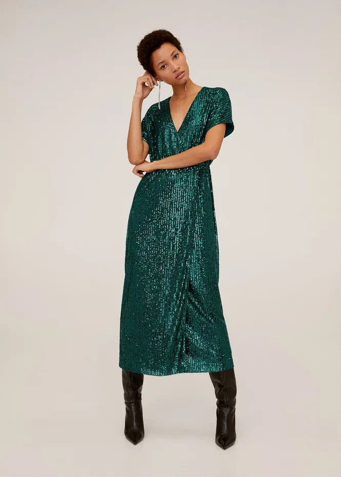 Блестящее зеленое платье-миди с запахом станет отличным решением для выхода в свет. Пайетки — традиционный атрибут вечеринок, который будет актуален всегда. Если ищешь вечерний наряд, который послужит тебе далеко не один раз, обрати внимание на выбранную нами модель.