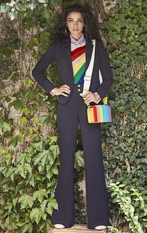 Ну а самый писк сезона — полосатый брючный костюм. Особенно если он с двубортным жакетом — это самый актуальный фасон. А если поверх жакета надет мягкий широкий пояс на шнуровке, ты рискуешь превратиться в самую первую модницу сезона.