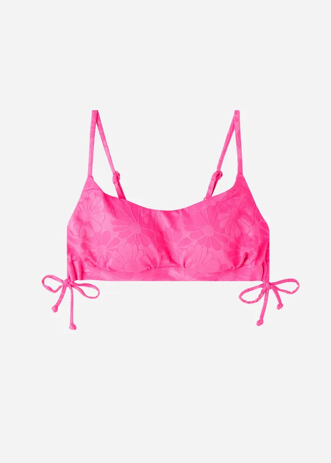 - фактурным бикини, в которых цветы нашиты как аппликация. Этот трюк как раз поможет сделать грудь больше!