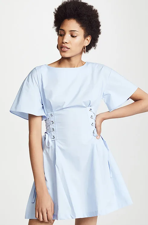 Платье голубого цвета с лентами — простой, но стильный вариант для прогулки с подругами. Оно одинаково хорошо будет смотреться и с кедами, и с яркими туфлями.