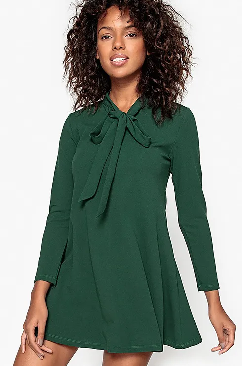 Платье благородного изумрудного цвета лучше всего сочетается с аксессуарами и обувью коричневого цвета. Советуем надеть его с пальто-халатом и замшевыми ботфортами.