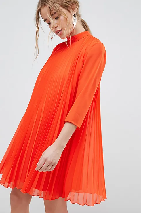 Плиссированное платье-трапеция не только скроет все недостатки фигуры, но и подчеркнет красоту твоих ног. Носи его с кожаными кедами или с трендовыми белыми ботильонами.