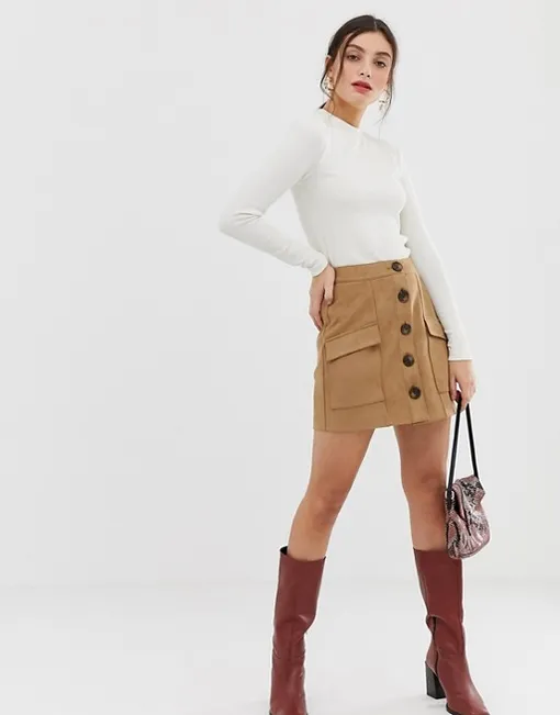 Стильная юбка одного из самых модных оттенков этой весны. Модель выполнена из искусственной замши и декорирована массивными прямоугольными карманами и большими пуговицами по центру. Носи ее с текстильными ботфортами на высоком каблуке и легкой монохромной водолазкой в рубчик.
