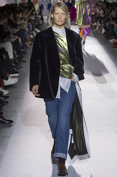 На подиумах были замечены все обозначенные вариации. Что касается цветовой палитры, то классический синий — особенно его темные, насыщенные проявления - правит бал, несмотря на эпизодические подиумные вспышки в голубых и черных тонах.