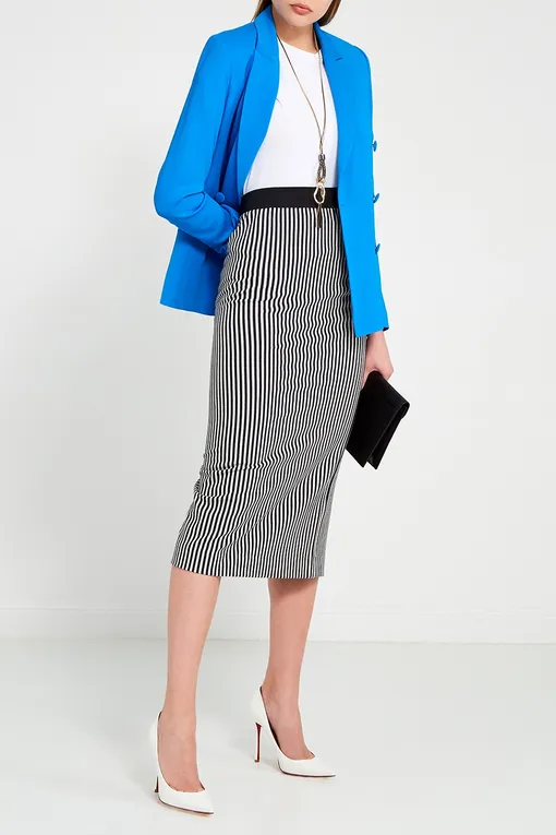 Юбка подходит как для прогулки с друзьями, так и для бизнес-встречи. Модель сшита из натурального хлопка в тонкую сине-белую полоску. Облегающий крой подчеркивает линии фигуры, верх на широком однотонном поясе, длина чуть выше щиколотки. Юбка заметно вытягивает силуэт, визуально делая фигуру более стройной и изящной.