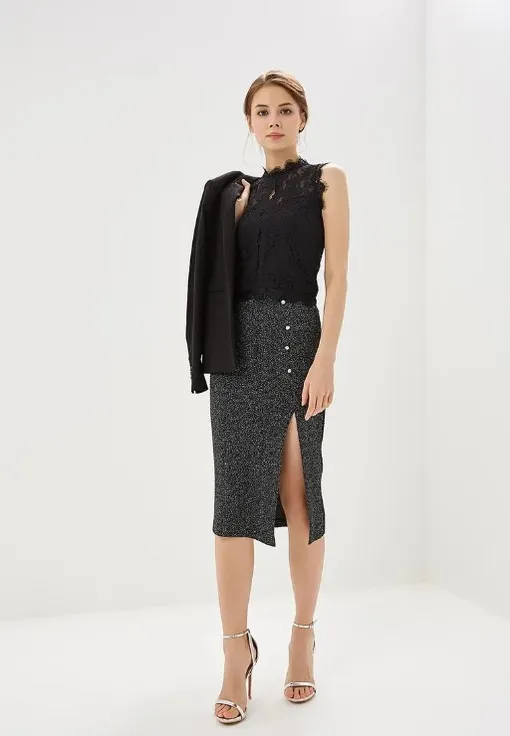 В такой юбке ты можешь пойти хоть на встречу с подругами, хоть на вечеринку. Советуем, подбирать к ней компактный верх: облегающий свитер или рубашку классического кроя. Модель выполнена в модном оттенке этого года «мартини с оливкой» и дополнена разрезом и высокой застежкой-молнией по центру. В сочетании с ботильонами на высоком каблуке такая юбка способна визуально сделать тебя на пару килограммов стройнее.