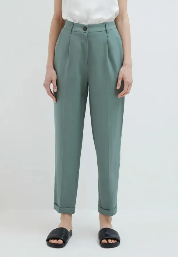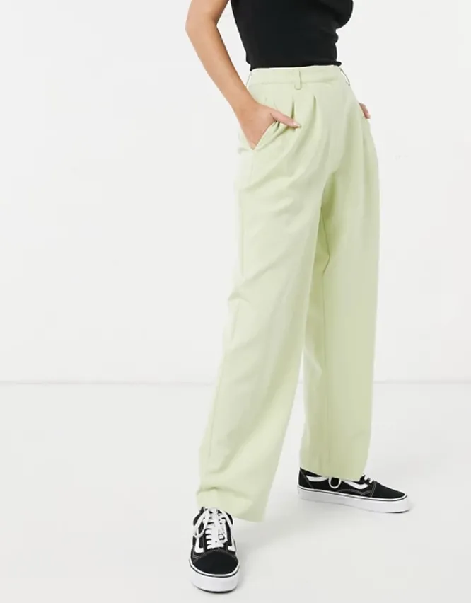 Поклонницам оверсайза стоит обратить на светло-зеленые брюки мужского кроя. Модель с высокой талией гармонизирует пропорции фигуры и поможет создать органичный лук для офиса или повседневной жизни.