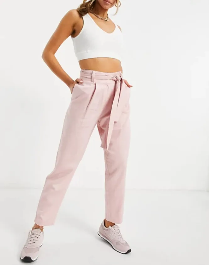 Идеальный вариант на лето — нежно-розовые льняные брюки на поясе.