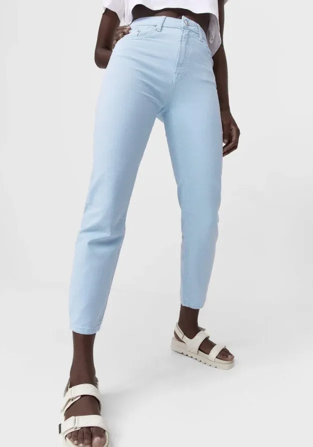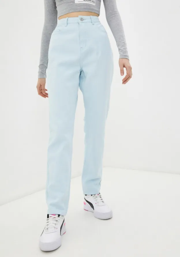 Также стоит обратить внимание на зауженные брюки чуть свободного кроя с высокой посадкой. Наш выбор — светло-голубой вариант. Такие брюки можно носить практически с любой парой обуви, облегающим топом и оверсайз-рубашкой, романтичной блузкой и спортивным свитшотом.