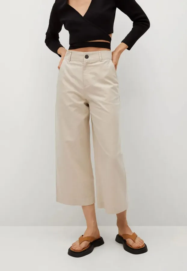Укороченные широкие брюки с высокой посадкой подходят невысоким девушкам. Чтобы визуально удлинить ноги, дополни их бежевыми лодочками на небольшом каблуке.