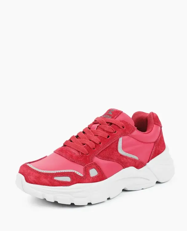 Красные комбинированные кроссовки станут стильным акцентом и в образе с джинсами, и в ансамбле с брючным костюмом.