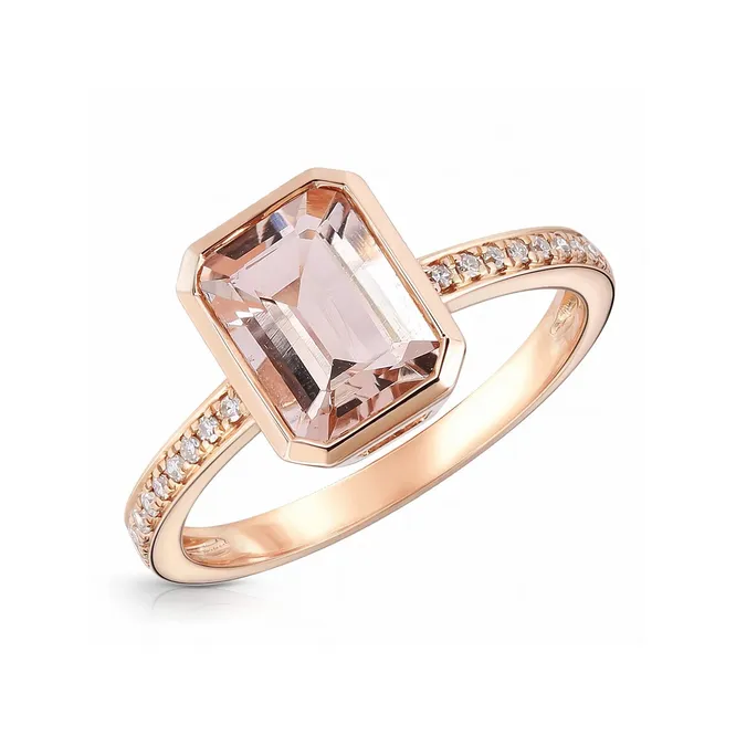 Начнем с кольца из красного золота с морганитом в центре. Ободок украшения декорирован россыпью бриллиантов, что придает ему еще более дорогой и элегантный вид.