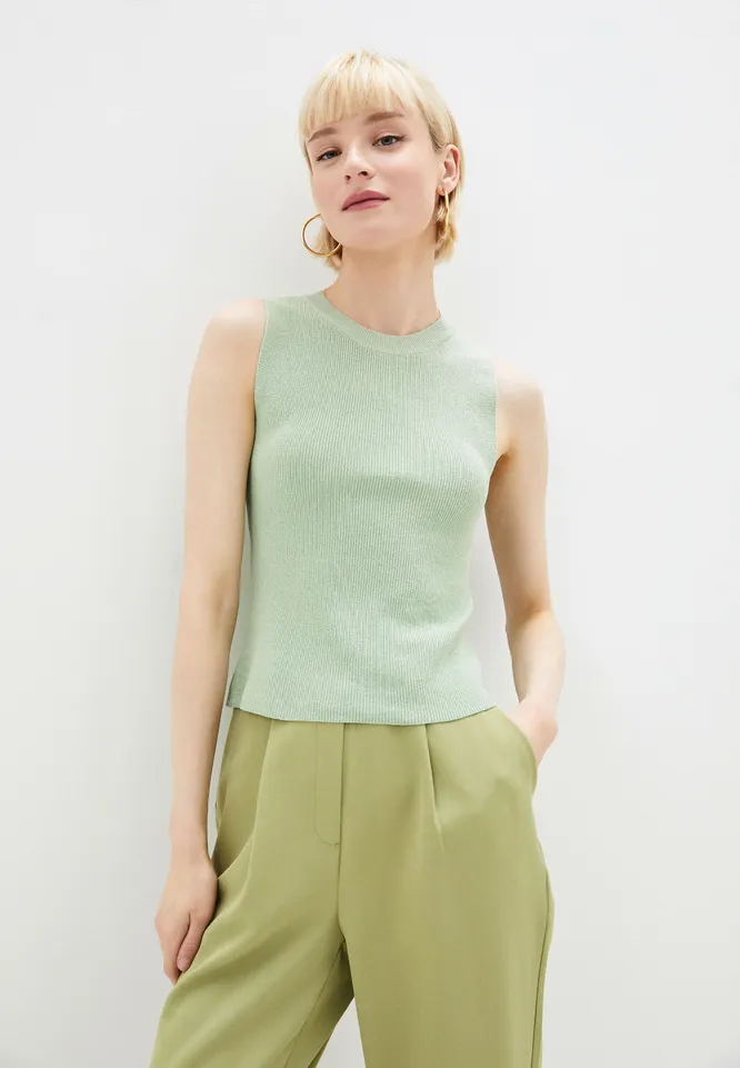 Не забываем и про тренд на пастельные оттенки. Бледно-зеленый топ — удачная альтернатива белым базовым футболкам.