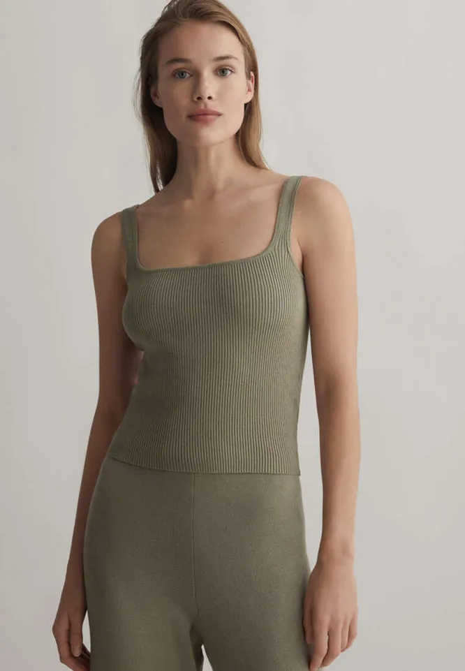 Идеальная база — трикотажный топ в рубчик модного цвета хаки.