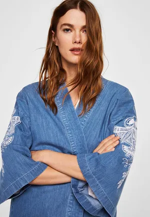 Накидку-кимоно из денима с вышивкой можно надеть на вечеринку или прогулку с подругами. Сочетай ее с базовыми футболками, скинни и кроссовками.