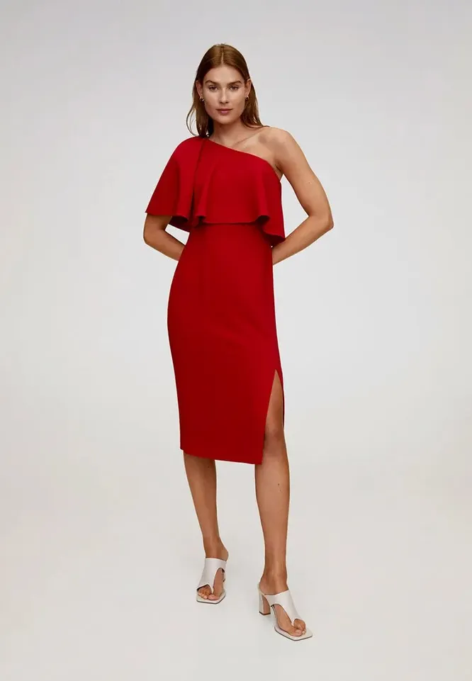Красное платье по фигуре — идеальный вариант для вечернего образа. Модель не слишком облегает тело, за счет чего ты будешь чувствовать себя в ней очень уверенно. Асимметрия, открытое плечо и невысокий разрез на ноге добавляют наряду кокетства. Дополняй композицию лаконичными босоножками на среднем каблуке и крупными серьгами.