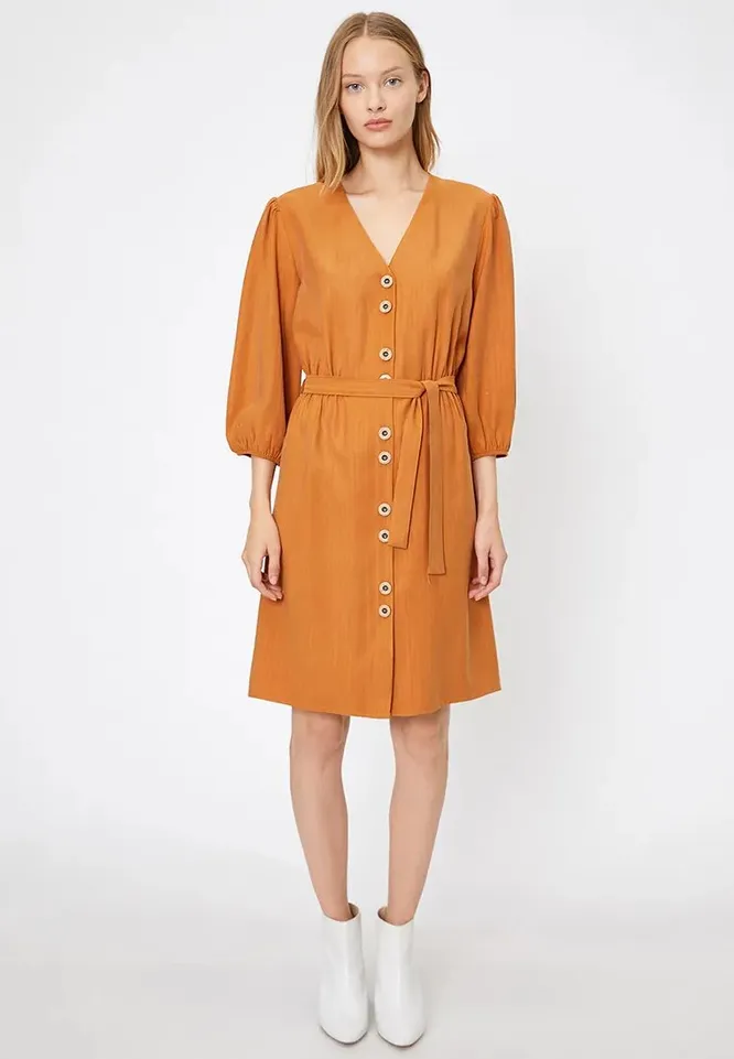 Для расслабленных образов выбирай оранжевое платье на пуговицах с поясом-завязкой на талии. Главный плюс этой модели — комфортная длина ровно до колена, которая идеально подходит девушкам любого роста и телосложения. Дополняют платье пышные рукава-фонарики, которые особенно актуальны в этом году.