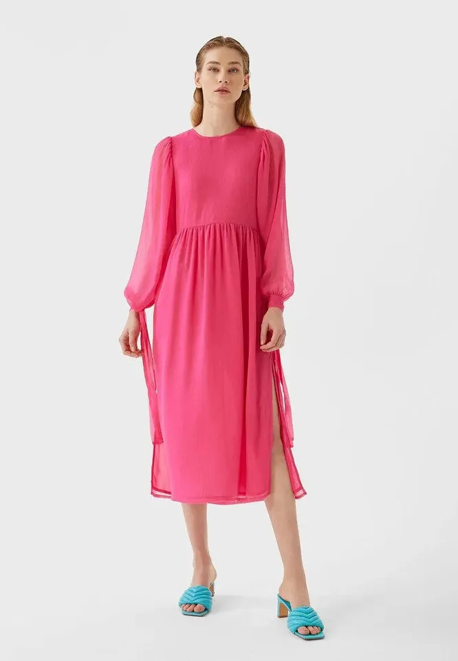 Легкая, воздушная ткань, лаконичный крой и сочный цвет — такой союз позволит тебе создать яркий, но при этом комфортный образ на лето. Сочетать это платье ты сможешь как с обувью на низком ходу, так и с каблуками. Выбирай вариант, который тебе кажется удобнее.