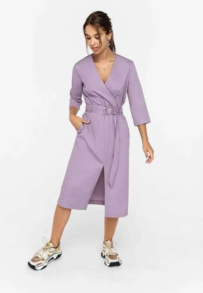 Для нежных романтиков подойдет платье лавандового цвета. Модель на запах с поясом на талии отлично подчеркивает женственные формы и делает образ еще более утонченным. На каждый день носи его с модными сандалиями на толстой подошве или лаконичными белыми кедами.