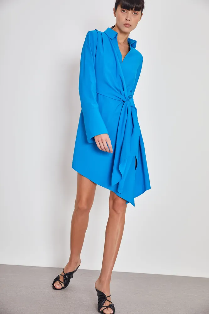 Поклонницы ярких решений точно оценят это сложносочиненное платье. Модель ярко-голубого оттенка декорирована запахом, длинным поясом-завязкой, асимметричным подолом и отложным воротничком. В меру строгая, в меру дерзкая — сочетай ее с босоножками с квадратным мысом и лаконичной сумкой.