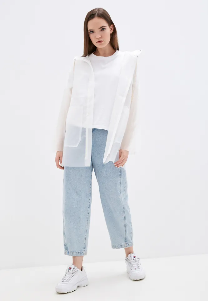 Белый прозрачный дождевик с капюшоном из полиуретана – отличный выбор на теплую, но дождливую погоду. Он достаточно легкий и нейтральный по стилю, поэтому подойдет под любой образ, будь то летний сарафан или базовые джинсы и джемпер. Дождевик можно легко сложить и взять с собой в поездку или на прогулку, что очень удобно. Чтобы сделать образ более интересным и ярким, добавь, например, желтые резиновые сапоги и панаму с принтом.