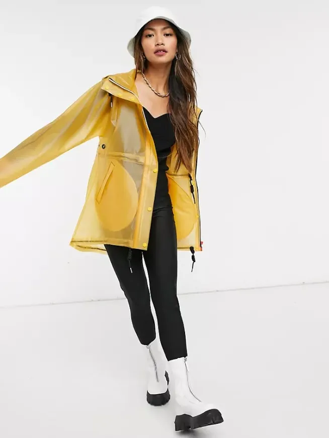 Лучший способ поднять себе настроение в ненастную погоду – надеть яркий плащ! В этом плане подойдет желтый прозрачный дождевик. Модель имеет вместительные боковые карманы, надежные застежки на молнию и кнопки, которые предотвращают попадание влаги внутрь. Дождевик выполнен из прочного гладкого полиуретана. Предлагаем носить его с черными прямыми брюками, белыми грубыми ботинками и панамой – получится комфортный повседневный образ. Если хочешь что-то более женственное, смело сочетай желтый дождевик с трикотажным платьем миди, водолазкой и плиссированной юбкой.