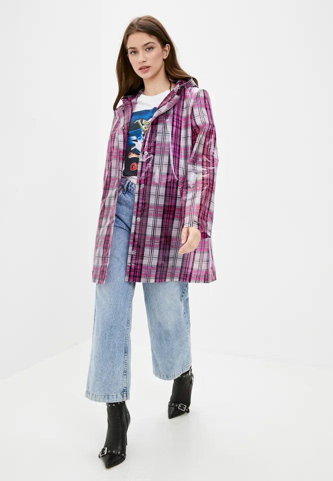 Если хочешь быть в центре внимания, выбирай полупрозрачный дождевик с голографическим эффектом. Модель из линейки plus-size подойдет не только полным, но и стройным девушкам. Чтобы образ был сбалансированным и органичным, сочетай дождевик с лаконичными однотонными вещами.
