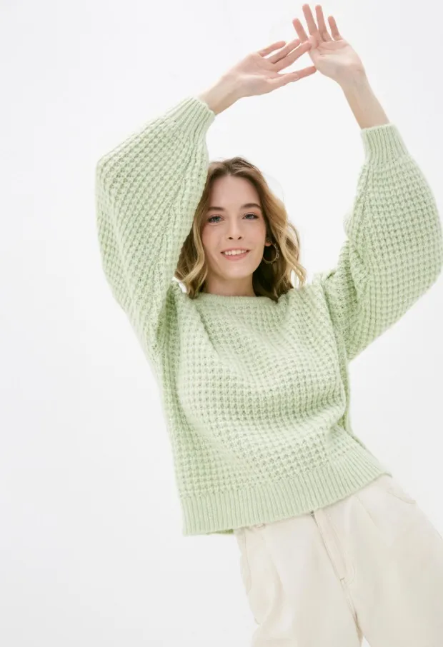 Если хочешь выглядеть моложе, не обходи стороной пастельные оттенки. Джемпер бледно-зеленого цвета с объемными рукавами поможет тебе создать модный фактурный образ.