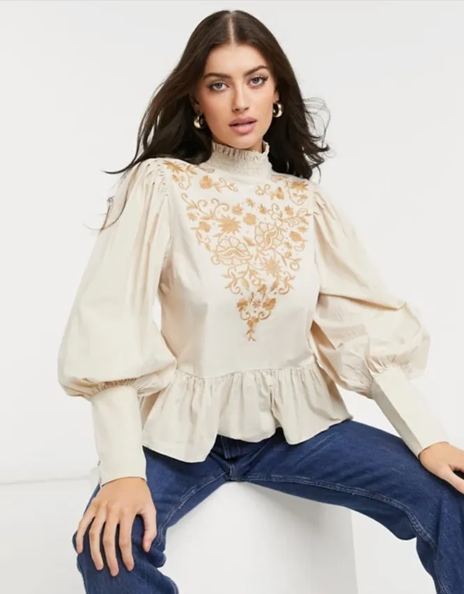 Добавить наряду легкость поможет романтичная блуза с рукавами-буфами и воротником-стойкой. Дополняй ее базовыми джинсами и кедами, если собираешься на прогулку, или юбкой по фигуре и туфлями на каблуке, если предстоит свидание или вечеринка.