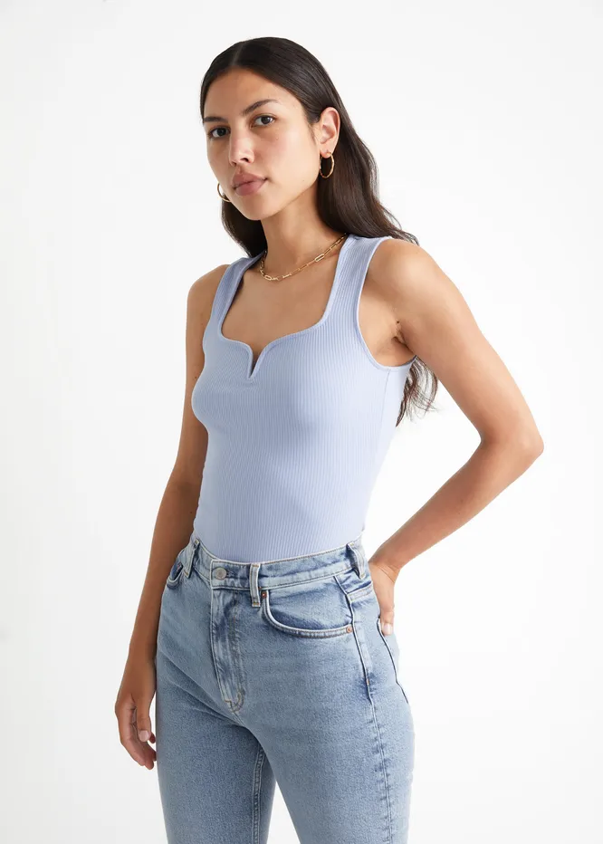 Базовый топ в рубчик нежно-голубого цвета идеально дополнит лаконичные джинсы, пеструю юбку или брюки.