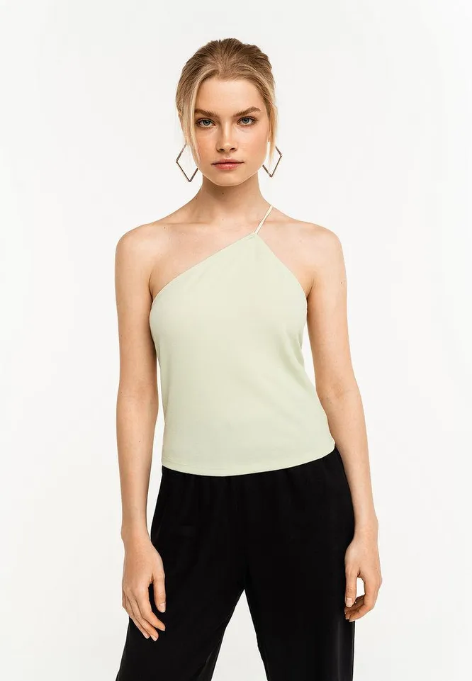 Лаконичный топ асимметричного кроя станет отличной основой для повседневного лука. Поверх можно накинуть свободную рубашку или пиджак.
