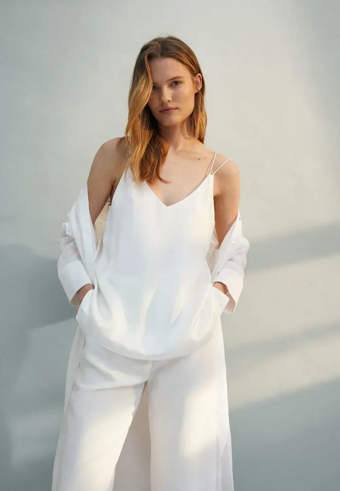 Лоснящийся топ из вискозы — лучшее решение для жаркой погоды. В нем можно пойти и на прогулку, и в офис, и на модную вечеринку.