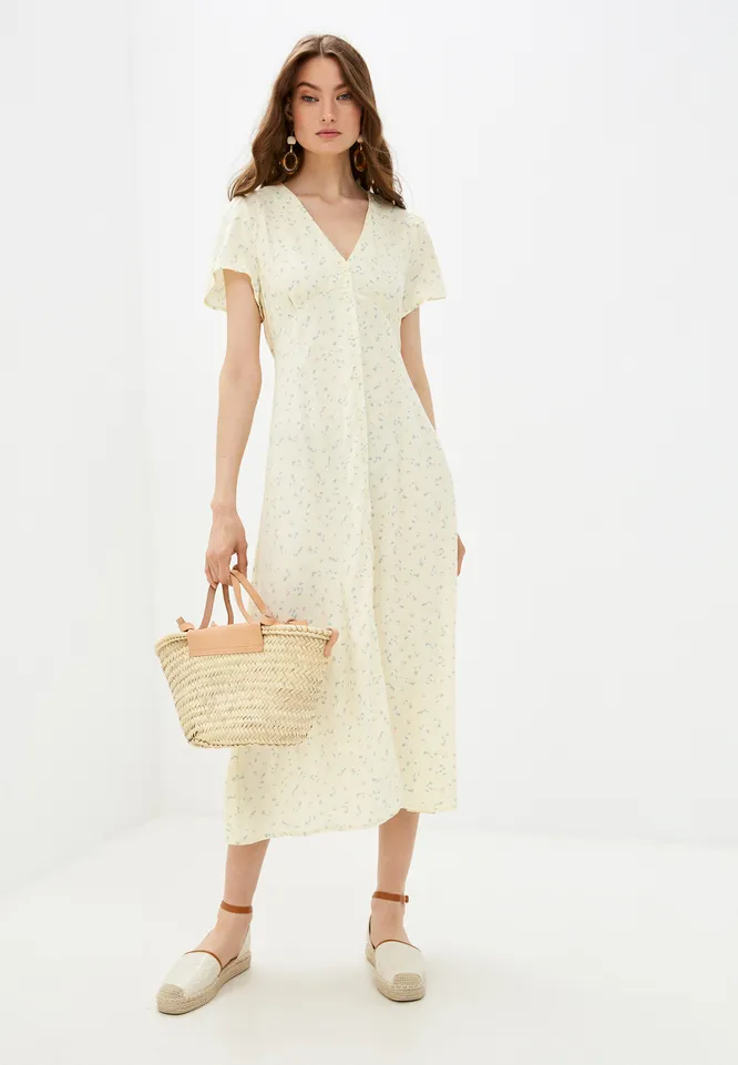 Чайное платье в стиле Кейт Миддлтон с нейтральным цветочным паттерном – отличная основа для женственного повседневного лука. Дополни его изящными босоножками и небольшой плетеной сумкой.