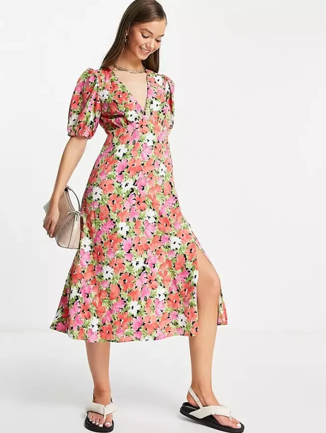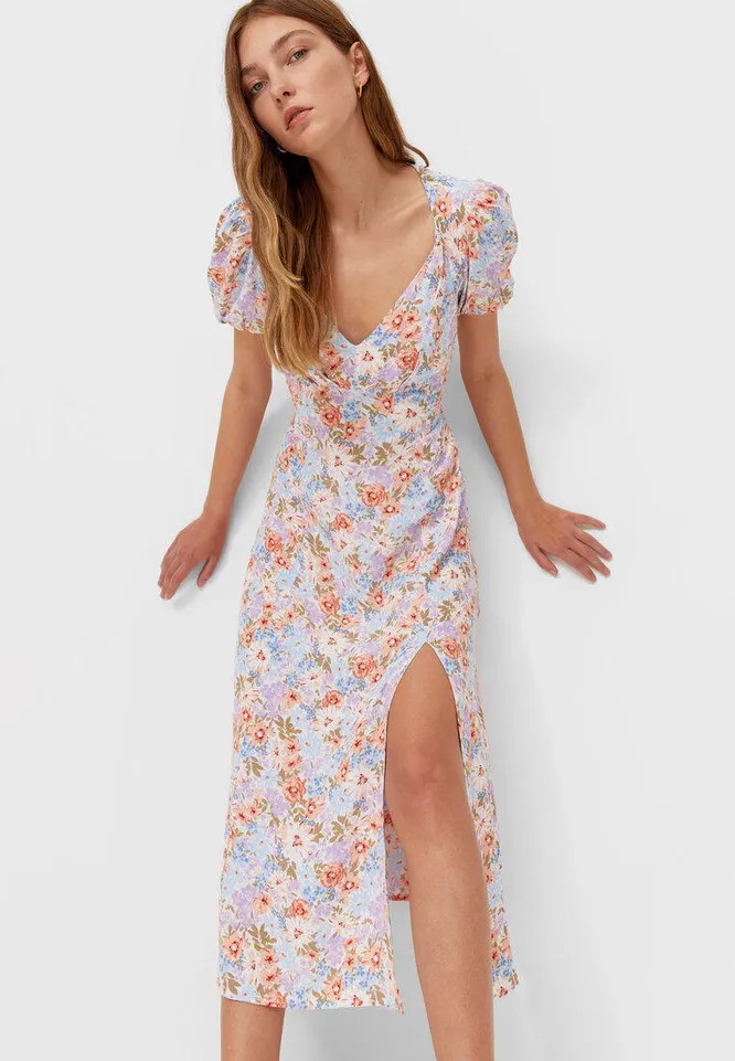 Мастхэв сезона — платье миди с рукавами-фонариками и длинным разрезом сбоку. Предлагаем носить его с босоножками с тонкими ремешками и яркими украшениями из бисера.