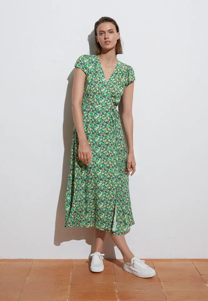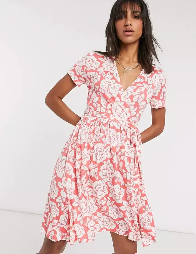 Для пляжных аутфитов подойдет платье миди с запахом. Заверши образ широкополой шляпой и плетеными сандалиями.