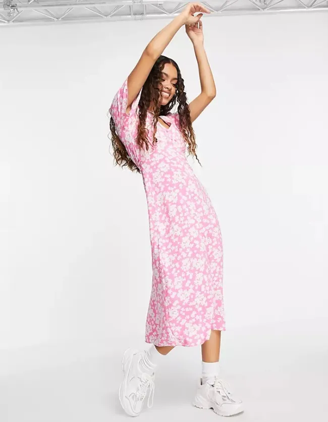 Чайное платье с рукавами-крылышками носи с белыми босоножками и небольшой сумкой.