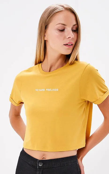 Для тех, кто устал от драм и любит яркие цвета, мы нашли эту укороченную футболку с ироничной надписью «Никаких больше тяжелых чувств». Носи ее с джинсами с высокой посадкой или плиссированной юбкой.