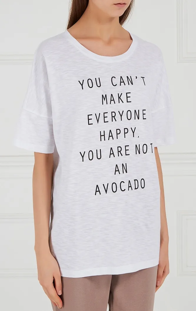 Надпись на этой майке гласит: «Ты не можешь сделать всех счастливыми, ты же не авокадо». Мы с этим утверждением полностью согласны, поэтому советуем никогда не переживать о том, что подумают о тебе окружающие. Всем не угодишь!