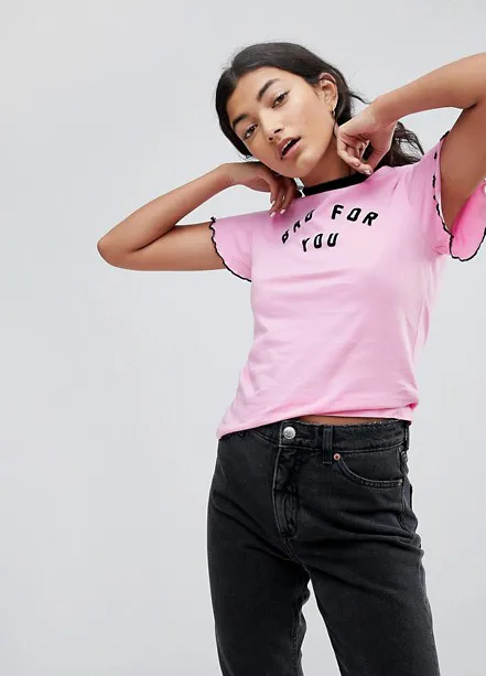 Милая розовая футболка с надписью «bad for you» будет отлично сочетаться со светлыми брюками и мини-юбками из денима. Отправляйся в ней на свидание — он обязательно оценит!