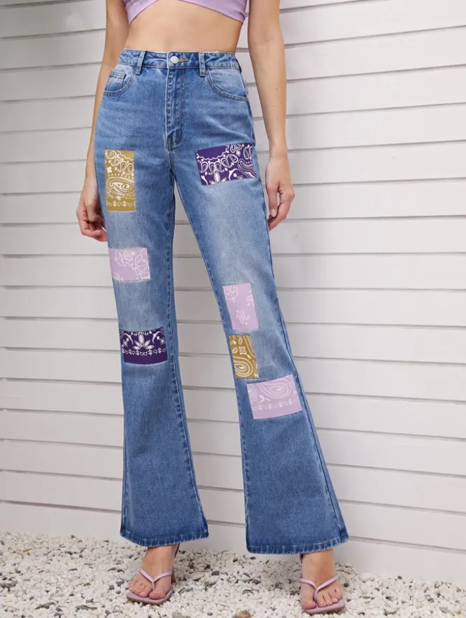 Поклонницам стиля бохо предлагаем модель с узорчатыми нашивками. Сочетай эти джинсы с коротким кардиганом по фигуре или блузой с расклешенными рукавами.