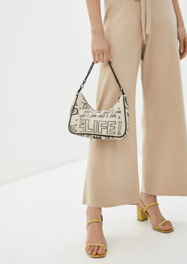 Интересный вариант — сумка на цепочке с надписями. Она преобразит даже самый простой лук.