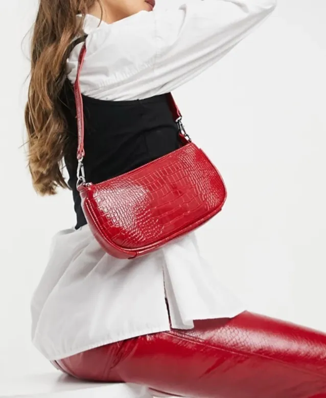 Красная сумка из искусственной тисненой кожи станет отличным дополнением к нарядам для вечеринок.