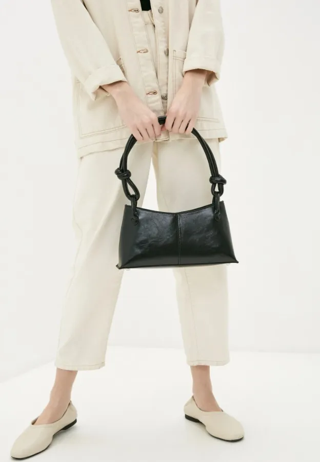 Лаконичная кожаная сумка с необычной ручкой подойдет поклонницам элегантных образов. Можно носить ее и с брючными костюмами, и со строгими юбками по фигуре, и с женственными платьями.