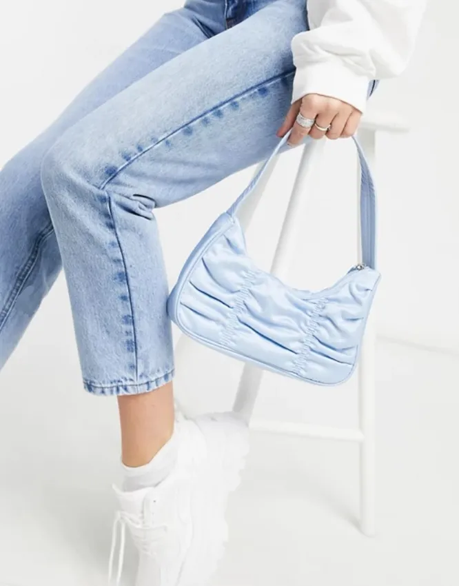 Светло-голубая атласная сумка со сборками станет интересным и изящным дополнением к повседневным образам. Ее можно носить и со спортивной курткой, и с женственным платьем, и со строгим костюмом.