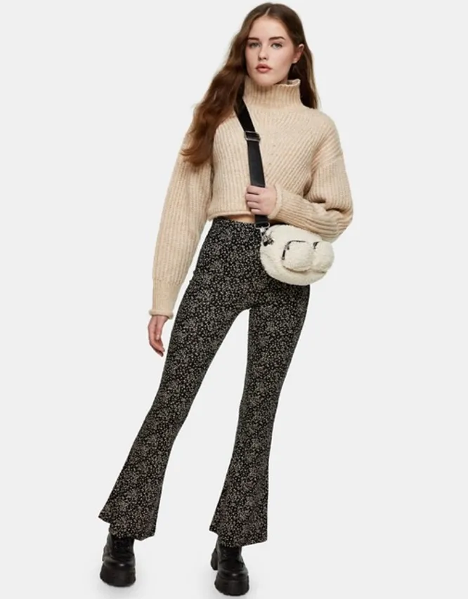 Для романтичных образов подойдут расклешенные брюки с мелким цветочным принтом. Лучшим дополнением к ним станет воздушная блуза или топ с драматичными воланами.