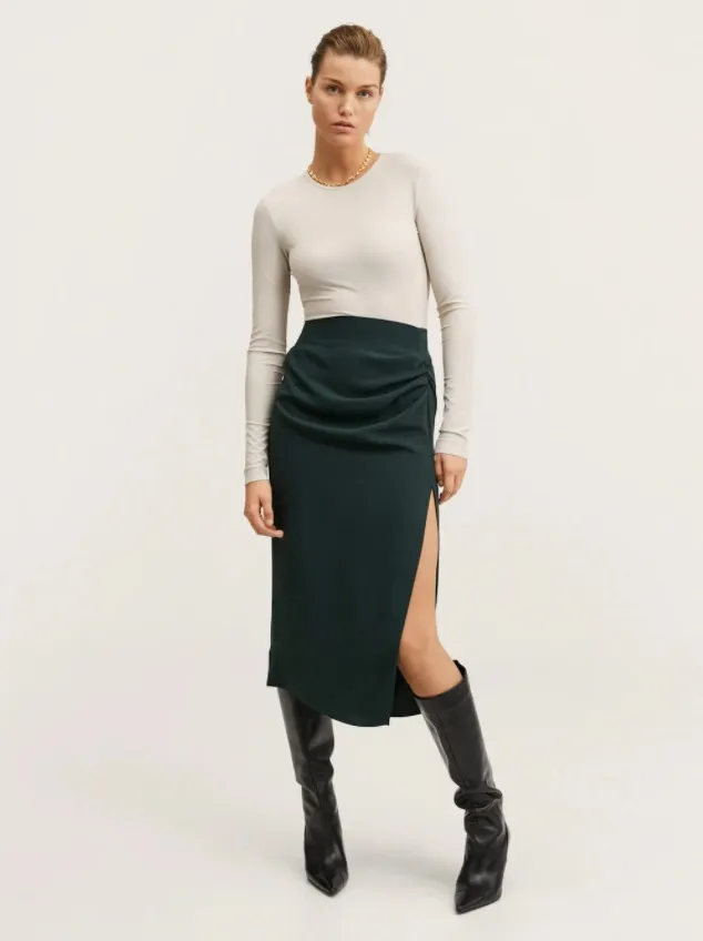 На фото – модная юбка-карандаш, которая идеально подойдет для вечерних и романтических образов. В первом случае предлагаем сочетать юбку с длинным разрезом с бралеттом и пиджаком мужского кроя или с водолазкой и нарядными остроносыми ботильонами на каблуке. На свидание комбинируй ее с изящными сапогами и воздушной блузой с объемным бантом.