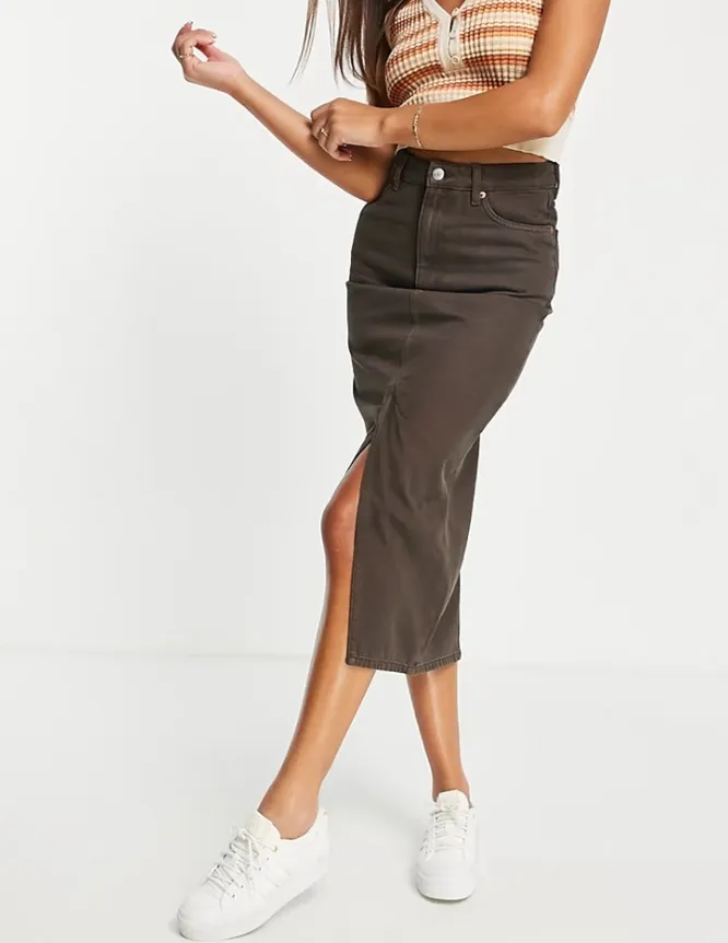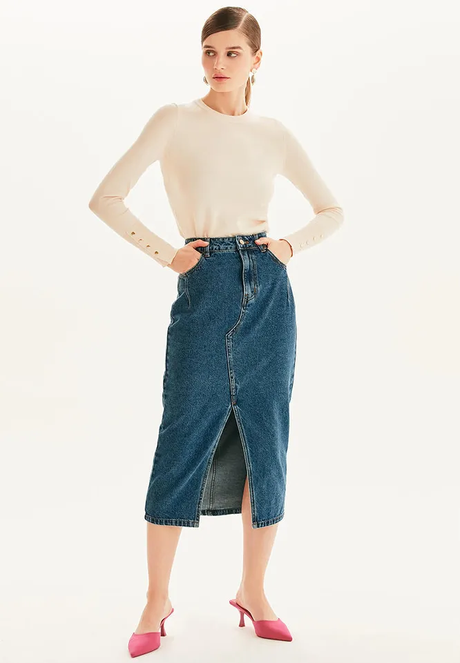 Узкая джинсовая юбка миди также станет универсальной вещью в гардеробе. В любое время года с такой юбкой-карандаш получатся модные луки. Например, зимой ее можно носить с объемным свитером и грубыми ботинками челси, а летом – с вязаным кроп-топом и кожаными шлепанцами на толстой подошве.
