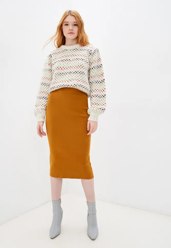 В списке модных тенденций 2022 остаются юбки-карандаш из трикотажа. Наш первый фаворит — модель горчичного цвета длины миди. Хорошо смотрится в паре с пуловерами и джемперами, а также фактурными кардиганами и свитерами. Отдавай предпочтение вариантам из плотного трикотажа, который не будет просвечивать и подчеркивать несовершенства фигуры.
