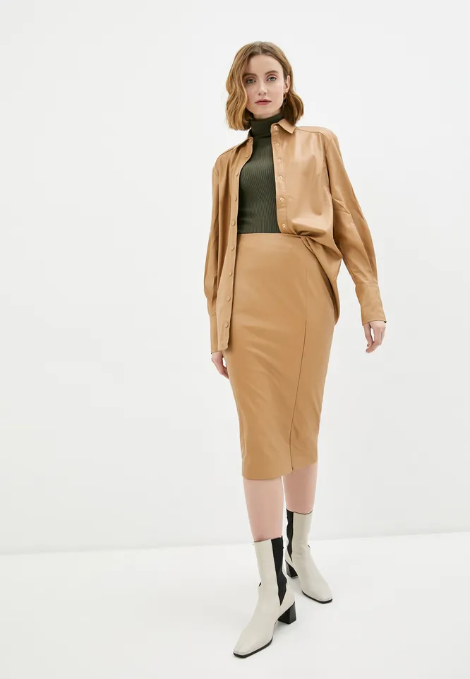 Модная практика показывает, что юбка-карандаш из кожи всегда актуальна. Главное – выбрать удачную модель и правильно ее стилизовать. Удачным выбором станет лаконичная бежевая юбка из кожи без лишних декоративных элементов. Такая модель легко впишется в любой повседневный лук, будь то деловой аутфит со строгой рубашкой или расслабленный ансамбль с оверсайз-джемпером.